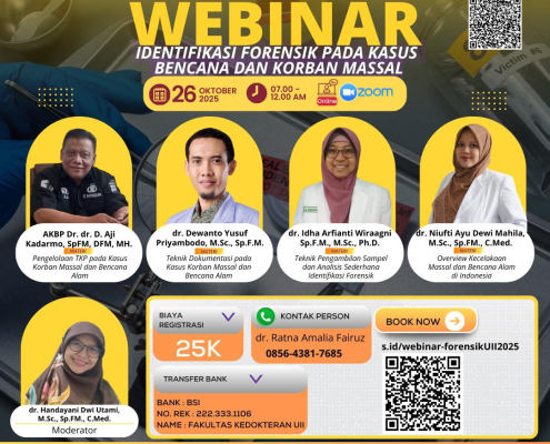Departemen Forensik, Etika dan Hukum Kedokteran FK UII bekerjasama dengan RS Bhayangkara POLDA DIY mengadakan WEBINAR FORENSIK yang berjudul Identifikasi Forensik pada Kasus Bencana & Korban Massal