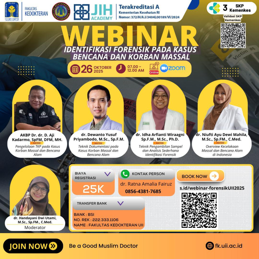 Departemen Forensik, Etika dan Hukum Kedokteran FK UII bekerjasama dengan RS Bhayangkara POLDA DIY mengadakan WEBINAR FORENSIK yang berjudul Identifikasi Forensik pada Kasus Bencana & Korban Massal